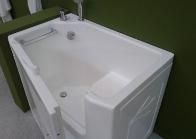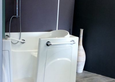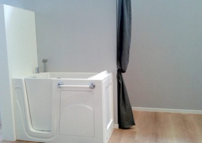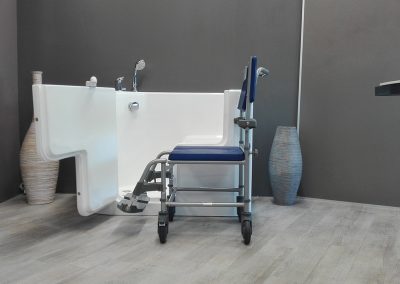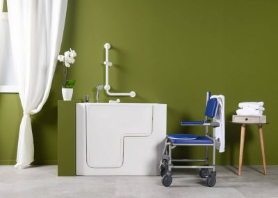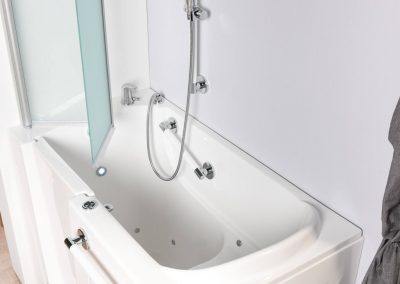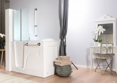 Es una bañera con amplio y cómodo acceso facilitado por un pequeño escalón de solo 15 centímetros de altura, una puerta salva espacio con apertura interior y un asiento anatómico.